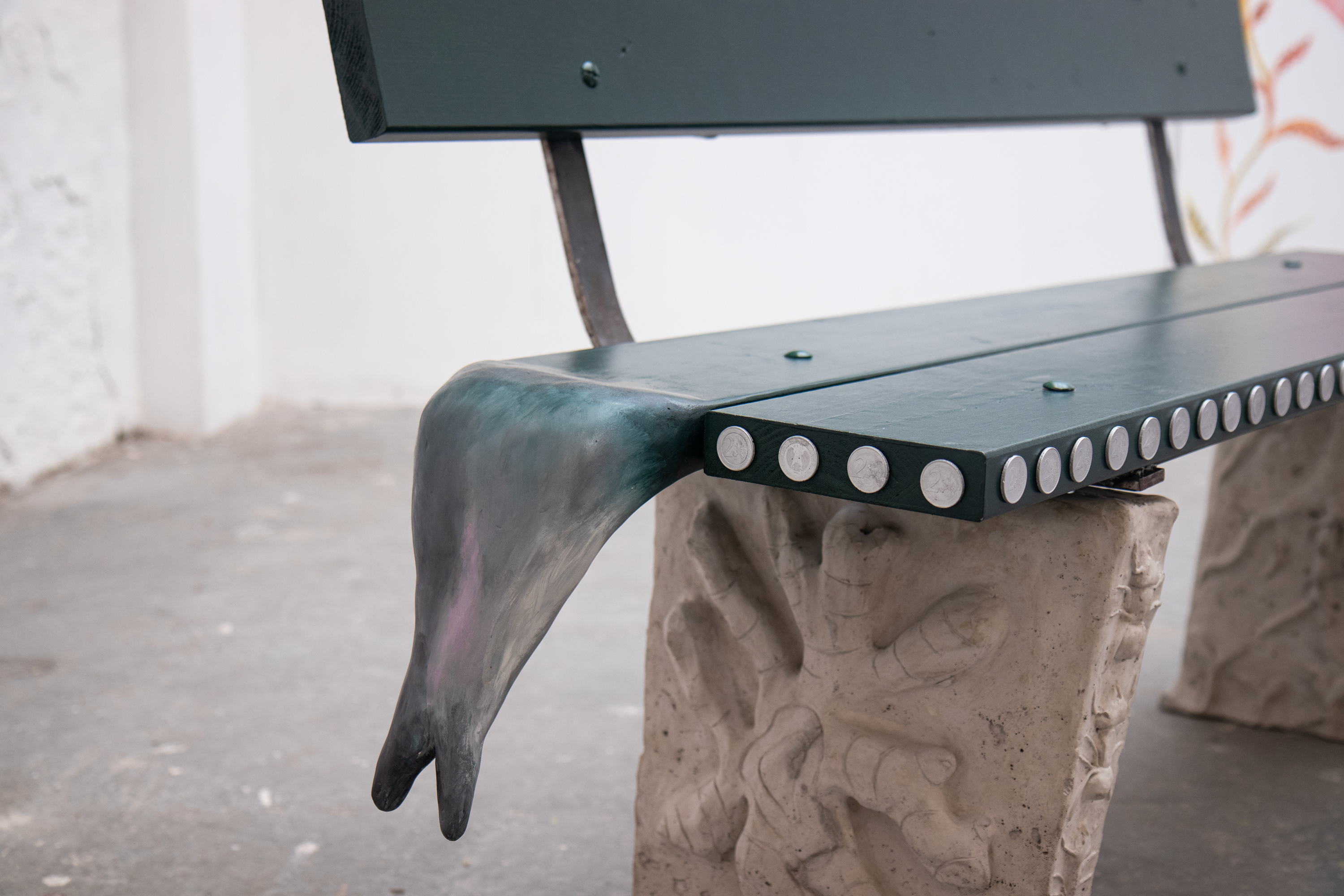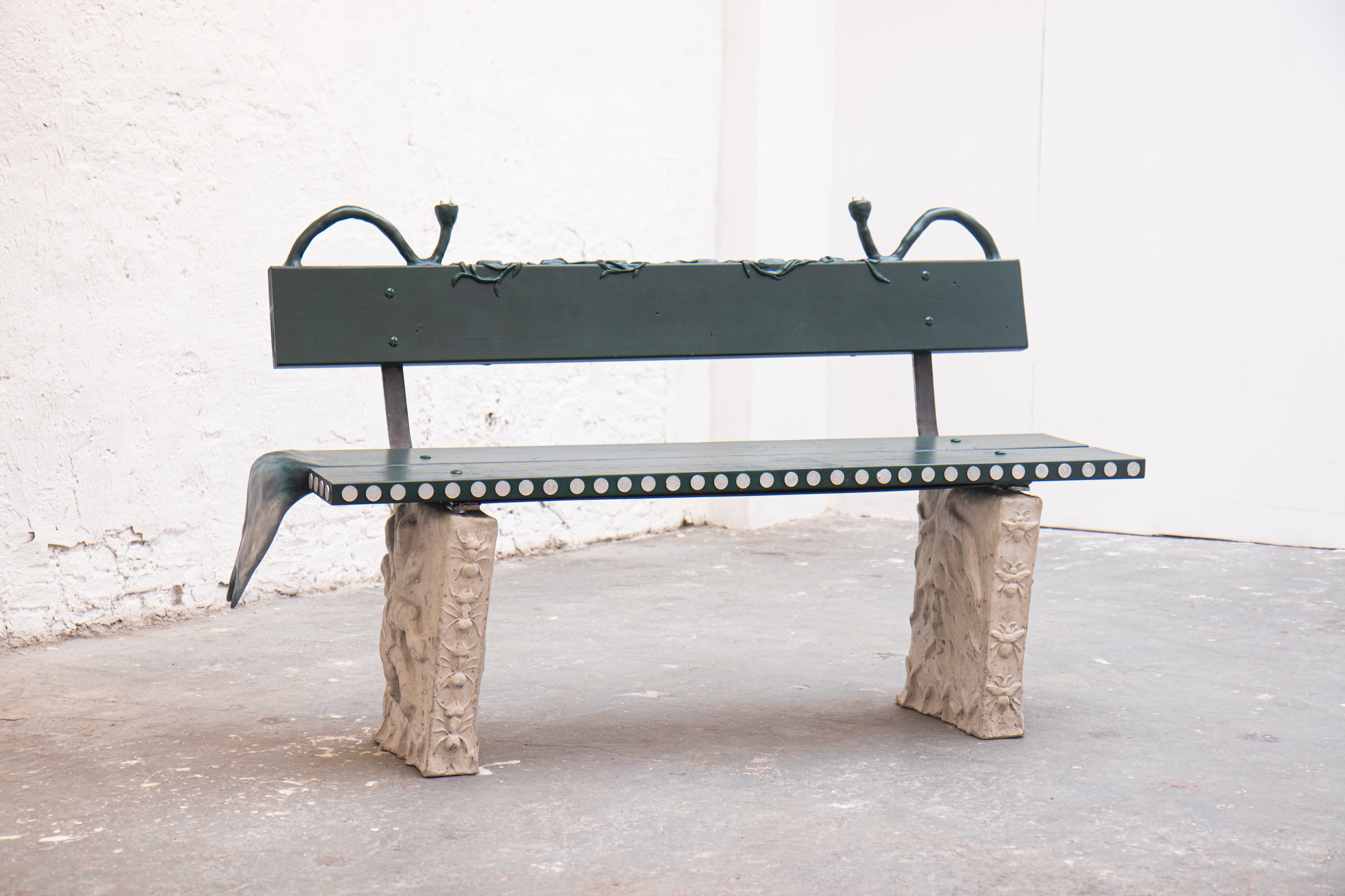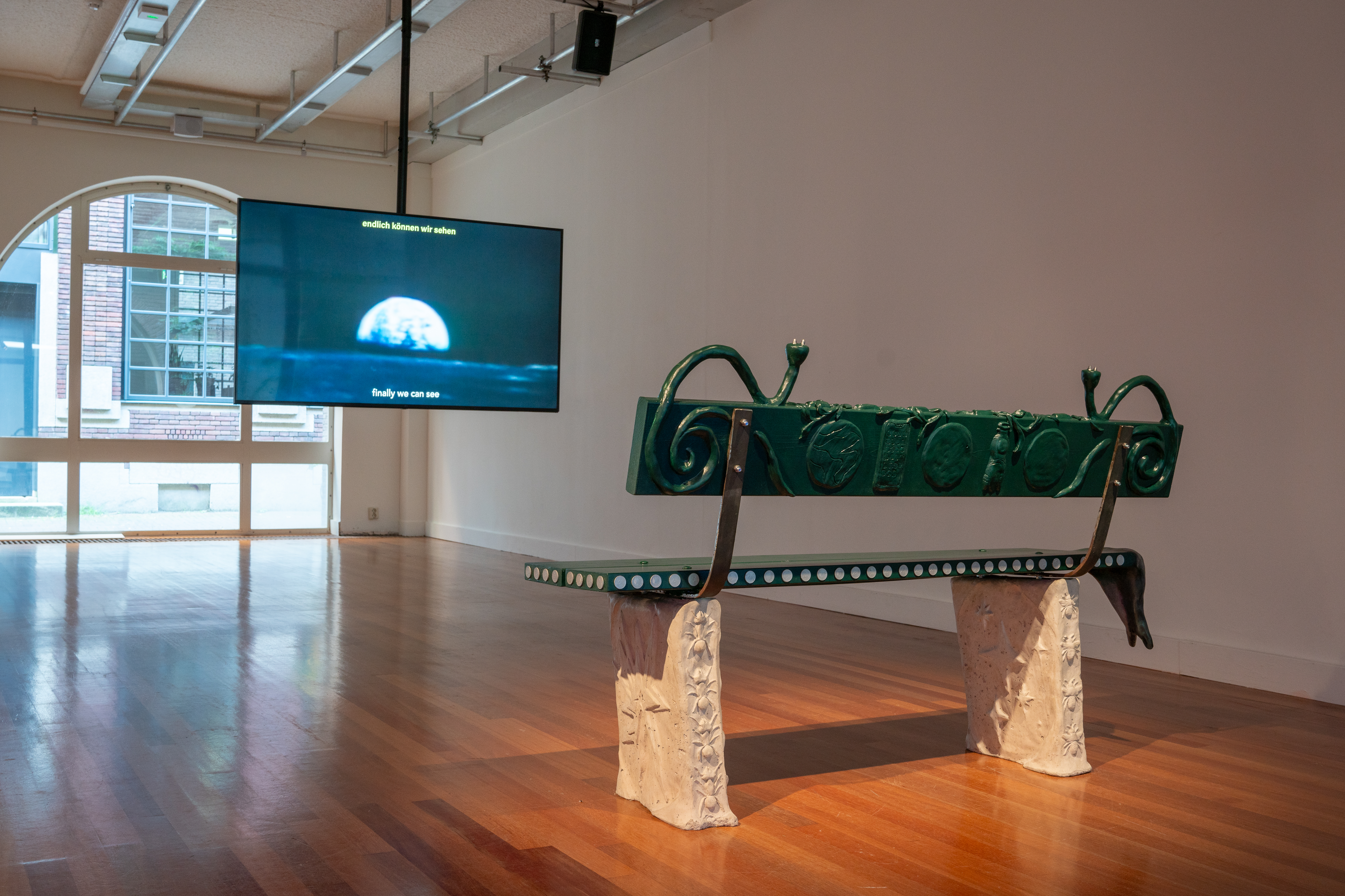 This bench stands in relation to the film There was a Never, there was a Yes (2023), which is based on the orginal poem Venus transit (2022). Decorated with symbols featured in both the film and poem, the bench structurally resembles those set along the river in Mainz, where it was first exhibited. While existing in relation to the film, the bench stands as an independent piece. As such it challenges traditional notions of what is considered monumental. It remains undecided in its role - whether it seeks to claim the status of a cultural memorial or to exist as a quieter element of public architecture.